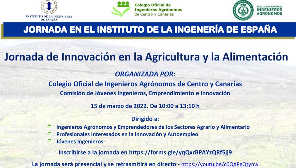 El grupo de trabajo Jóvenes Ingenieros, Emprendimiento e Innovación del Colegio, en colaboración con la Asociación Nacional de Ingenieros Agrónomos (ANIA) y el Instituto de la Ingeniería de España (IIE), organiza la jornada "Innovación en la Agricultura y la Alimentación", que tendrá lugar el 15 de marzo, de 10 a 13:10 h. Se podrá seguir presencialmente o por YouTube.